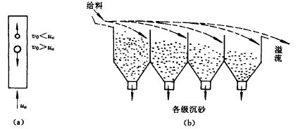 分級過程的示意圖見圖1(a),沉降末速大于上升介質(zhì)流速的礦粒下沉到分級設(shè)備的底部,作為沉砂或底流排出;沉降末速小于上升介質(zhì)流速的細(xì)粒級產(chǎn)物從上端溢出,成為溢流。如果要得到多個粒級產(chǎn)物,則可將溢流(或沉砂)在依次減小(或增大)的上升水流中繼續(xù)進(jìn)行分級。