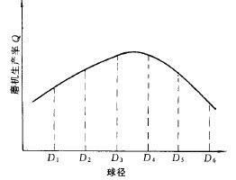 實(shí)驗(yàn)室磨機(jī)的規(guī)格小,相應(yīng)的給礦粒度也小,試驗(yàn)結(jié)果可作為中細(xì)磨機(jī)的球徑選擇依據(jù)。因?yàn)榻o礦粒度小,通常3~5mm以下,給礦粒度范圍窄,因此采用單種球徑球組進(jìn)行試驗(yàn)即可。選擇的球組不應(yīng)低于3組,較好的是5或6組,目的是要將待求更好的球徑包括在內(nèi),不漏掉較佳值。當(dāng)其它參數(shù)固定不變時(shí)磨機(jī)指定級(jí)別在生產(chǎn)率與球徑之間的關(guān)系是一個(gè)單峰函數(shù),如圖3-5-2所示。如果選擇D1、D2、D3三種球,生產(chǎn)率曲線到D3時(shí)呈上升趨勢(shì),無法判定D3,是較好的球徑值;同樣,選擇D4、D5、D6三種球時(shí),也無法判定D4是較好的球徑值,只有使生產(chǎn)率曲線達(dá)到峰值和導(dǎo)數(shù)轉(zhuǎn)向時(shí)才能找出更好的值。