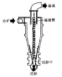 | 旋流器的構(gòu)造如圖3-4-17所示。主要由一個空心圓柱體和圓錐體連接而成。圓柱體的直徑代表旋流器的規(guī)格,由50~1000mm,常用者為125~500mm。在圓柱體中心插入一個溢流管,沿切線方向接有給礦管,在錐體下部留有沉砂(或稱底流)口。 |