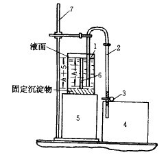 淘析法水析裝置也稱薩巴寧沉降分析儀,如圖3-4-12所示。淘析過程是在一個直徑為70~100mm、高度為150~170mm的玻璃杯1中進行的。杯內(nèi)裝有一根直徑約為6~10mm的虹吸管2。虹吸管的短管部分應(yīng)插入杯內(nèi),使其管口下端距固體沉淀物料面留有5mm的距離。虹吸管另一端帶有管夾3,插入到溢流收集槽4內(nèi)。