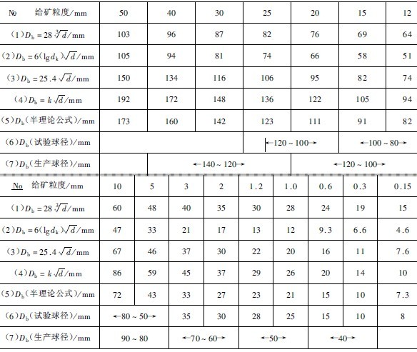 等,分別按各個(gè)經(jīng)驗(yàn)公式的意義和規(guī)定進(jìn)行計(jì)算。計(jì)算結(jié)果也列入表3-5-6以便和球徑半理論公式的計(jì)算結(jié)果進(jìn)行比較。為了和我國的實(shí)際資料相比較,在表3-5-6中再列入我國的實(shí)踐資料,它們多半是各選礦廠歷年來的經(jīng)驗(yàn)值。后再加上試驗(yàn)研究值。3mm以下給礦的球徑為筆者的試驗(yàn)研究值,5mm以上的給礦為近幾年一些廠礦降低球徑的生產(chǎn)試驗(yàn)結(jié)果。通過這種比較。也可以判斷球徑半理論公式計(jì)算結(jié)果的準(zhǔn)確程度和可靠性,是一種比較廣泛和全面的檢查驗(yàn)證方式。