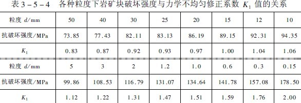 (1)巖石力學(xué)性質(zhì)的不均勻性修正。粗礦塊內(nèi)部宏觀和微觀裂紋多,故強(qiáng)度低。而當(dāng)?shù)V塊變細(xì)后各種裂紋逐漸消失,強(qiáng)度逐漸增大。原蘇聯(lián)學(xué)者曾對(duì)不同粒度的礦塊作過(guò)破壞強(qiáng)度測(cè)定研究,測(cè)定資料見(jiàn)表(3-5-3)。但當(dāng)?shù)V粒度小于1mm時(shí)尚未見(jiàn)到測(cè)定資料。芬蘭胡基教授曾作過(guò)不同粒度下的磨碎功耗測(cè)定,結(jié)果說(shuō)明粒度變細(xì)與功耗的增加不是直線的比例關(guān)系。而呈類(lèi)似冪函數(shù)的曲線關(guān)系增長(zhǎng),表明細(xì)磨時(shí)功耗增加比粒度變小快得多。參照胡基的研究和筆者進(jìn)行的細(xì)磨研究,在表3-5-4, 中補(bǔ)充了1mm以下的破壞力數(shù)值和修正系數(shù)。