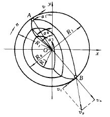 鋼球落到落回點(diǎn)B時,其速度vp可分解為從磨機(jī)中心到落回點(diǎn)B方向的法向分速度vn及與筒體圓周相切的切向速度v1。法向速度vn用于沖擊礦塊,切向速度v1沿筒壁切線方向?qū)ΦV塊或礦粒產(chǎn)生磨剝作用。這里主要考慮鋼球?qū)ΦV塊的沖擊作用,故未考慮v1。