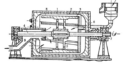 圖2為原蘇聯(lián)研制的臥式離心磨機(jī),其結(jié)構(gòu)如下:1為固定不動(dòng)的筒體,其內(nèi)表面敷設(shè)形如兩個(gè)截圓錐組成的錳鋼襯板2。3為帶輪翅的轉(zhuǎn)子。轉(zhuǎn)子3經(jīng)過(guò)輪殼5固定在轉(zhuǎn)軸4上。輪殼5上設(shè)有孔6,以便研磨介質(zhì)和礦漿7的循環(huán)。旋轉(zhuǎn)轉(zhuǎn)子安裝在軸承8中。給料量由轉(zhuǎn)子3與襯板間的間隙9的大小來(lái)調(diào)節(jié)。磨礦產(chǎn)品經(jīng)排料管10排出。帶輪翅的轉(zhuǎn)子3旋轉(zhuǎn)時(shí)產(chǎn)生離心力,在此離心力作用下給入到磨機(jī)的礦漿也產(chǎn)生旋轉(zhuǎn),由此而產(chǎn)生較大的礦漿壓力。物料在沖擊和磨剝作用下被粉碎。轉(zhuǎn)子的速度達(dá)每秒12米,這樣可保證被磨物料能很好分級(jí),從而大大減少礦泥的形成。該離心磨機(jī)在巴拉哈什選礦廠進(jìn)行了工業(yè)試驗(yàn)。