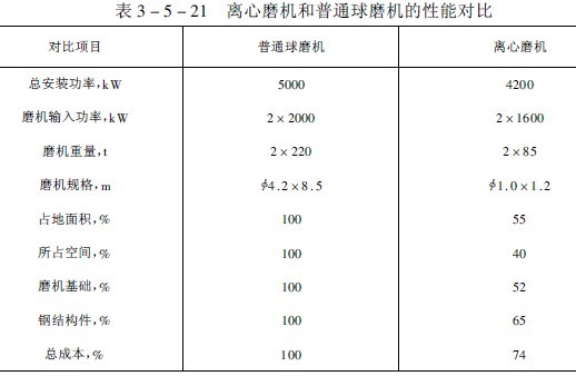 德國(guó)魯奇公司在南非礦山,對(duì)離心磨礦機(jī)和常規(guī)球磨機(jī)的設(shè)備性能作了詳細(xì)的經(jīng)濟(jì)對(duì)比,結(jié)果如下:某礦山的鐵礦石磨碎到要求的磨礦產(chǎn)品細(xì)度,每種磨機(jī)產(chǎn)量為每年2000萬(wàn)噸,給礦粒度為6毫米,磨礦產(chǎn)品細(xì)度的比表面積為1700~1800厘米2/克,采用水力旋流器進(jìn)行濕式閉路磨礦等相同條件下,選用一臺(tái)4.2×8.5米常規(guī)管磨機(jī)和1.0×1.2米離心磨礦機(jī)進(jìn)行試驗(yàn)比較,對(duì)比結(jié)果如表3-5-21所示。由表可知,離心磨礦機(jī)組的總成本為球磨機(jī)組的74%。