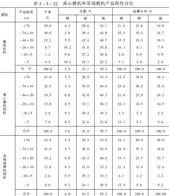 表3-5-21的所示的結(jié)果表明,兩種磨機(jī)在單位能耗基本相同的條件下,磨礦產(chǎn)品的粒度組成和比表面積,以及研磨介質(zhì)工作表面的磨耗大致相同。由此可見(jiàn),采用離心磨礦機(jī)代替常規(guī)球磨機(jī),對(duì)選別作業(yè)的工藝制度并無(wú)影響。