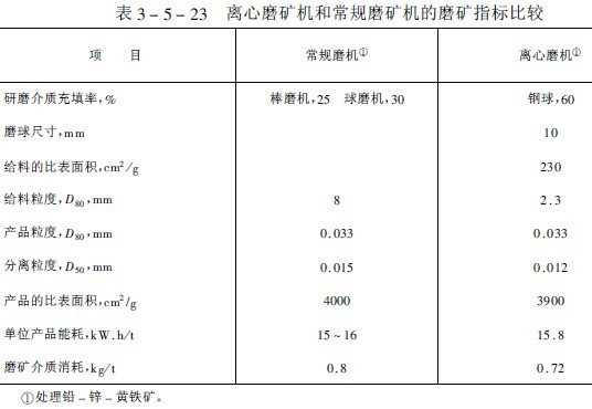 離心磨機(jī)既可用于濕式開(kāi)路流程,又可與水力旋流器構(gòu)成閉路流程。離心磨機(jī)(250×300毫米)和旋流器閉路磨礦與常規(guī)球磨機(jī)的磨礦結(jié)果,如表3-5-23所列。