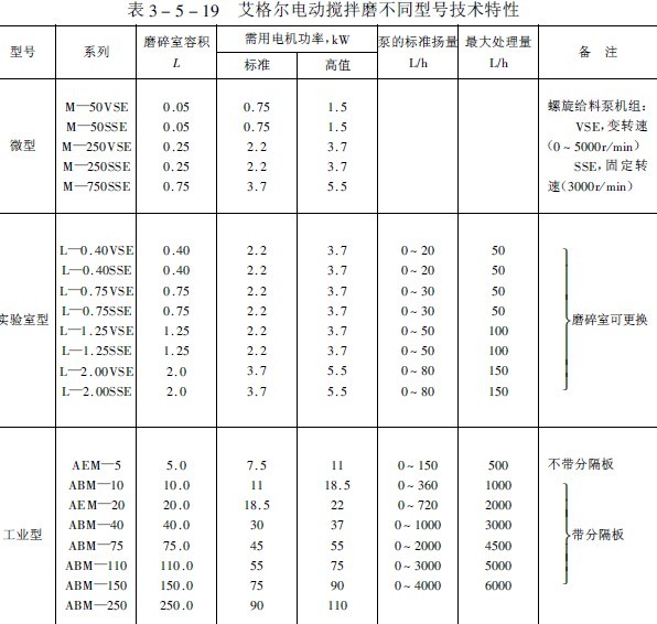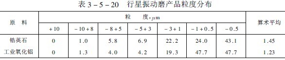 的轉動形成了筒繞Ⅰ號軸的公轉;Ⅱ號輪帶動Ⅵ號輪形成磨筒繞其自身軸的自轉。這種磨機兼有行星磨和振動磨二者的特點,具有高頻沖擊和磨剝的雙重作用,故磨碎作用強,是一種有效的超細磨碎設備。表3-5-20示出了用該磨機磨碎鋯英石和工業(yè)氧化鋁的產(chǎn)品粒度分布。