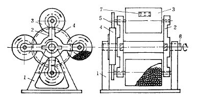 圖2示出了回轉磨機的結構及工作原理。當轉動軸6旋轉時,筒體1除在水平方面旋轉外還圍繞2在垂直方向旋轉,這樣促使研磨介質(zhì)作非常復雜的運動。筒體在垂直方向和水平方向適宜的速比為1:1~1:1.5。