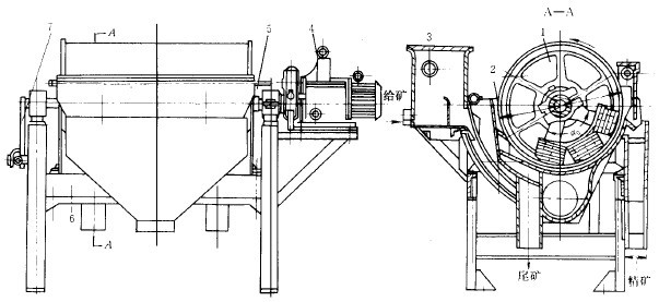 槽體下部有噴水管,用來調(diào)節(jié)礦漿的濃度,把礦漿沖散成懸浮狀態(tài)以利選別。