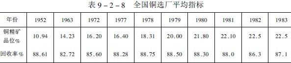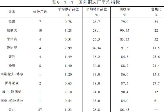 國內(nèi)銅選礦現(xiàn)狀我國現(xiàn)有32座大中型銅選廠,年產(chǎn)方噸以上精礦含銅量的有銅錄山、德興、白銀、易門、落雪等選廠??谔幚砹吭?000噸以上的有13座,500~3000噸的有15座。礦石入選品位平均為0.94%,雖然原礦品位逐年下降,但銅精礦品位則隨著選礦工藝的發(fā)展和技術(shù)進步而逐年提高,如表9-2-8所列。
