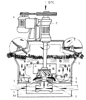 每個(gè)浮選槽均由槽體1、軸承體(連同中空主軸)2、斜棒葉輪3、穩(wěn)流器4、刮板5、傳動(dòng)裝置6及凸臺(tái)等組成。吸入槽中,除有上述部件(凸臺(tái)由壓蓋代替)之外,在其中空主軸的下端還有提升葉輪7、壓蓋8和底盤(pán)9(見(jiàn)圖1)。浮選槽只起浮選作用。吸入槽除起浮選作用外,還兼有吸漿能力,即把槽外的礦漿通過(guò)提升葉輪的作用并經(jīng)導(dǎo)管10吸入槽內(nèi)。穩(wěn)流器是由幾十條垂直放置的曲率不同的圓弧板所組成。凸臺(tái)(及壓蓋)是用穩(wěn)流器的圓弧形邊緣壓在槽體底部的。