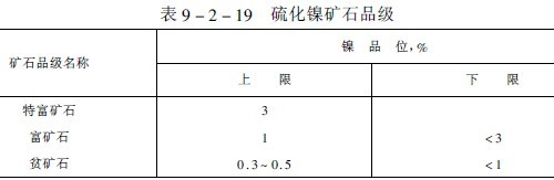 硫化鎳礦石的品級(jí)標(biāo)準(zhǔn)列于表9-2-19。