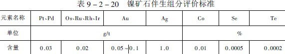硫化鎳礦除含銅外,還伴生有鉑族金屬、鈷、金、銀、硒、碲等有價(jià)元素,評(píng)價(jià)標(biāo)準(zhǔn)列于表9-2-20。