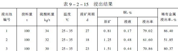 由于尾砂粒度細(xì)、難滲濾,故采用浸出池進(jìn)行生產(chǎn),先加酸化水中和礦石中的堿性脈石,待溶液pH值達(dá)2.0左右時(shí),加入含菌高鐵(Fe sup 2+ /sup )的浸礦劑或浸出貧液(指含銅和稀有金屬降低,F(xiàn)e sup 2+ /sup 較高的浸出液)進(jìn)行循環(huán)浸出,直至浸出液銅、稀有金屬較低為止。然后,加銅稀有金屬含量較低的細(xì)菌高鐵液,當(dāng)浸出液濃度更低時(shí),再用水洗兩三天排料。尾砂浸出時(shí)間為二十天,浸出結(jié)果列于表9-2-15。