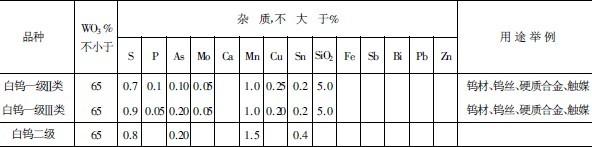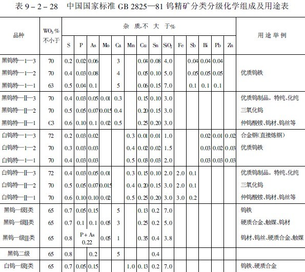 上述情況表明,冶煉對鎢精礦的質(zhì)量要求是非常高的。但市面上并無統(tǒng)一標準,通常是冶煉廠根據(jù)自己所具備的工藝條件,來選購所需的鎢精礦?,F(xiàn)將我國及世界有關(guān)國家所擬定的鎢精礦質(zhì)量標準,分別列表于后。表9-2-28為我國鎢精礦質(zhì)量標準,同時還規(guī)定可根據(jù)用戶需要和資源特點,自訂企業(yè)標準,這可使生產(chǎn)單位和使用單位在執(zhí)行標準時有靈活性。