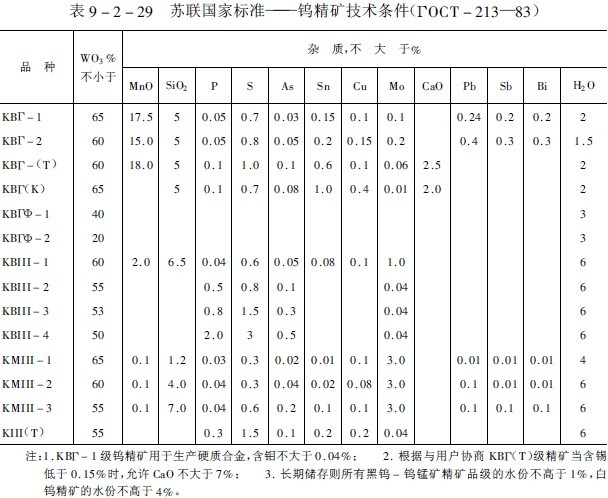 表9-2-29及表9-2-30為蘇聯(lián)國家鎢精礦產(chǎn)品標準,表9-1-31為國外質(zhì)優(yōu)鎢精礦產(chǎn)品標準。