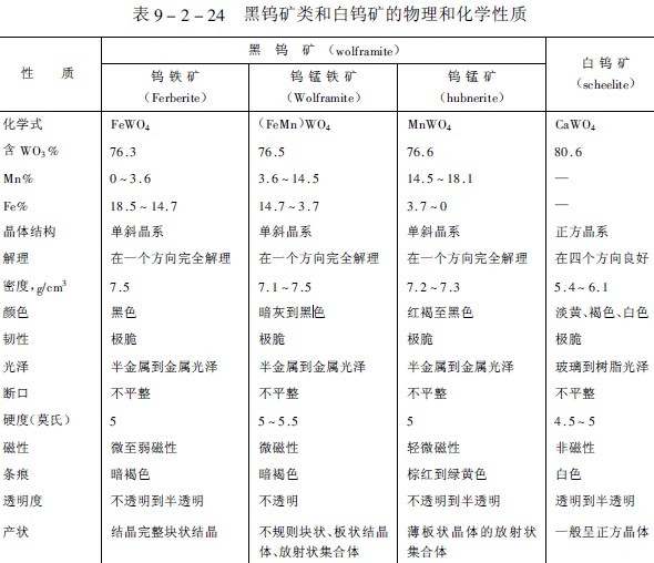 白鎢礦(CaWO sub 4 /sub )是鈣鎢酸鹽,結(jié)晶呈正方晶系,鉬可能取代白鎢礦中的鎢,而形成一種類質(zhì)同象的鉬酸鈣(CaMoO sub 4 /sub )礦。白鎢礦在紫外線輻射感應(yīng)下,發(fā)出鮮明的藍(lán)白色熒光,當(dāng)?shù)V物中有鉬存在時(shí),會改變熒光的顏色,隨著鉬的含量增加,逐漸由藍(lán)色變?yōu)槊咨?,淡黃色或橙色。表9-2-24是黑鎢礦類和白鎢礦的物理和化學(xué)性質(zhì)。