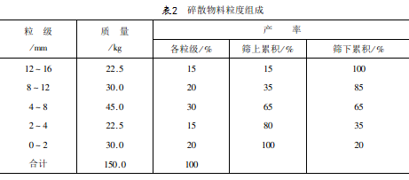 試驗結果處理的基本內容是計算產(chǎn)率。產(chǎn)率分為粒級產(chǎn)率與累積產(chǎn)率,粒級產(chǎn)率是該粒級的質(zhì)量占被篩物料總質(zhì)量的百分率,累積產(chǎn)率又分為篩上累積產(chǎn)率(又叫正累積)及篩下累積產(chǎn)率(又叫負累積)。正累積產(chǎn)率是大于某一篩孔的各粒級產(chǎn)率之和,負累積產(chǎn)率是小于某一篩孔的各粒級產(chǎn)率之和。在計算粒級產(chǎn)率時(shí),“被篩物料總質(zhì)量”可以用各粒級質(zhì)量之和,也可以用原試樣的質(zhì)量,此時(shí)把損失量加入較細級別,認為篩分時(shí)呈灰塵飛揚了?;镜暮Y分試驗記錄及結果處理如表2所示。